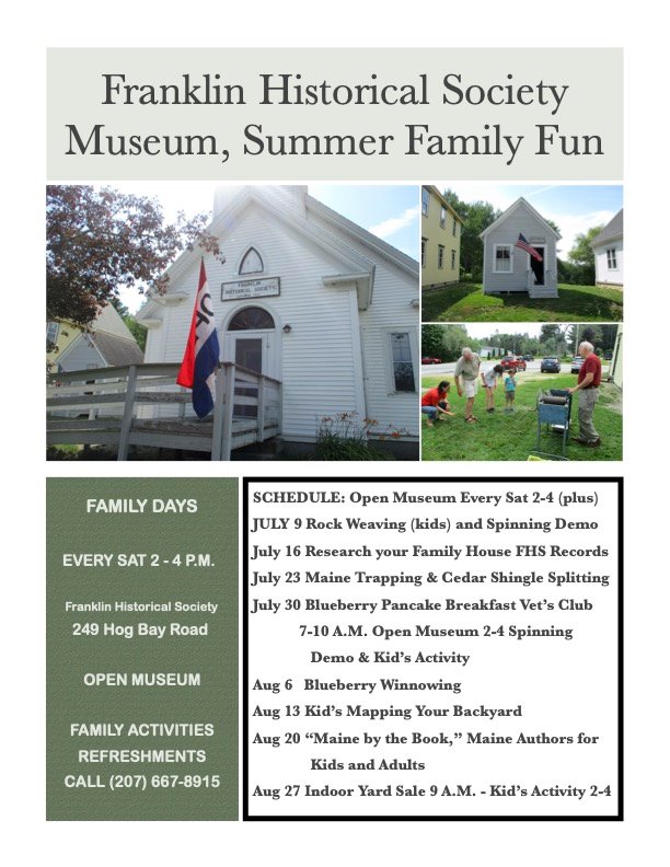 “Maine by the Book”: As part of its Summer programming, our sister organization Franklin Historical Society will host a program about Maine authors of children’s and adult books. Franklin Library Director Cathy FitzGerald will present a selection of both classic and contemporary writers. At the Historical Society from 2:00 to 4:00 p.m. Free to the public.