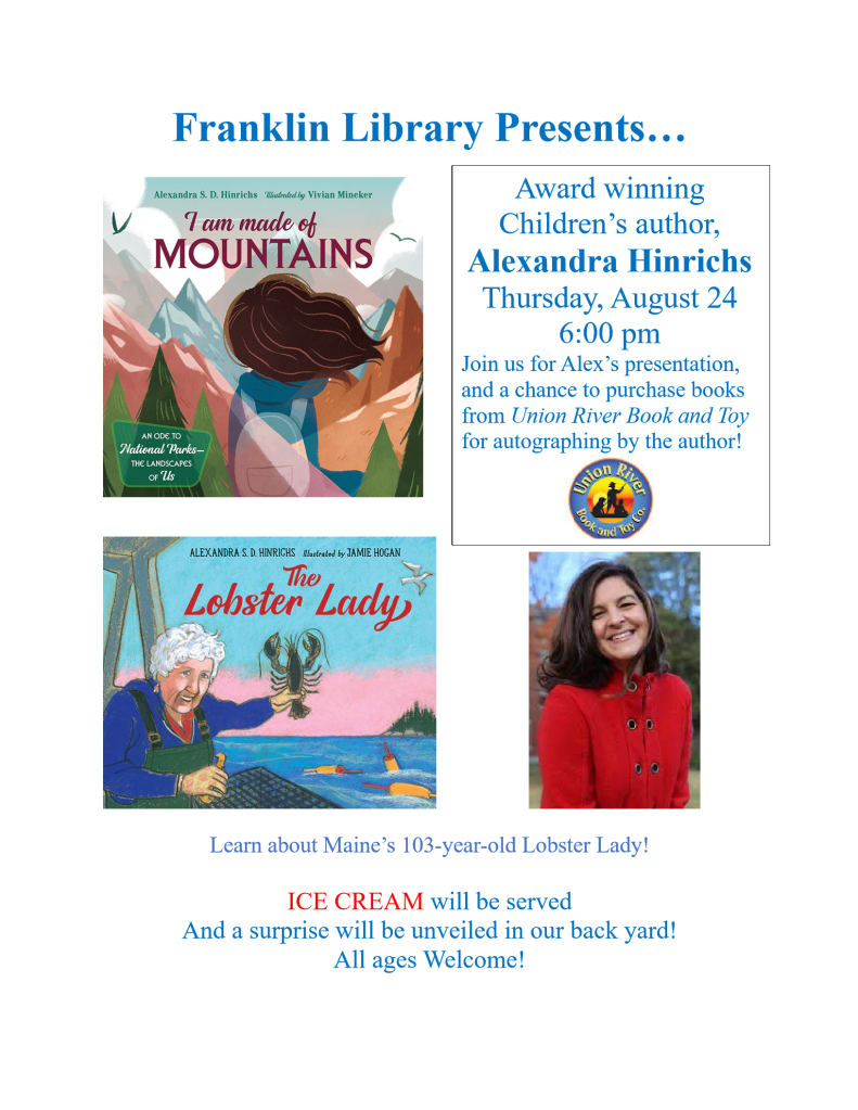 Presentation by the author of “The Lobster Lady” and “I am Made of Mountains”. Starts at 6:00 p.m. at the Library. Ice cream will be served!