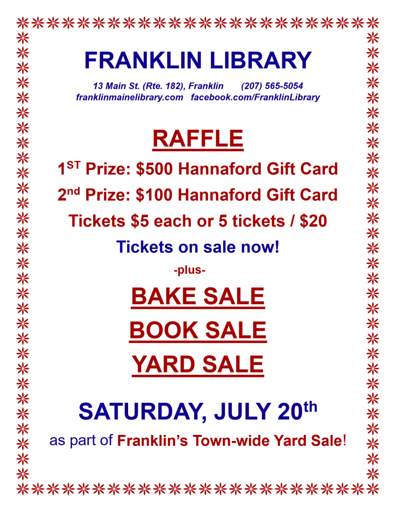 Raffle tickets on sale now at the Library. Drawing on July 20th – you do not have to be present to win. All proceeds benefit the Franklin Library.