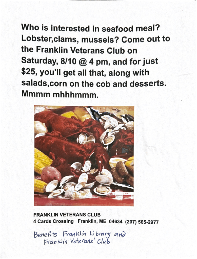 This Saturday 8/10: a great seafood feast for $25 at the Franklin Veterans Club. Proceeds benefit both the Vets Club and the Franklin Library!